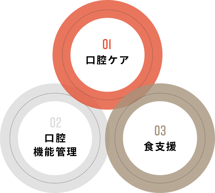 「噛む・飲み込む・話す」など、お口の機能を維持・改善するための支援です。歯科医療の立場から口腔機能評価や口腔リハビリ、トレーニングを行い、生活の質の向上を目指します。