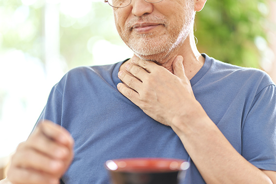 口腔機能低下症により食べ物を飲み込む力が弱くなると、食べ物や飲み物、唾液などが誤って気管に入ることがあります。この状態は「誤嚥」と呼ばれており、くり返すと肺に細菌が入り込み「誤嚥性肺炎」を引き起こす可能性があります。特に、パンやカステラなど水分が少ないもの、焼き海苔やワカメなど口の中にくっつきやすいもの、こんにゃくやところてんなどつるっとしたもの、豆やピーナッツなど小さいもの、液体などは、誤嚥を起こしやすいため注意が必要です。誤嚥性肺炎は重症化すると命にかかわるため、普段から口腔内を清潔に保ち、摂食・嚥下機能の維持向上に努めることが大切です。