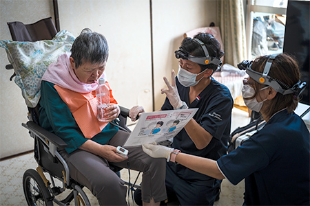 初回の訪問では、お口の状態だけでなく、全身の健康状態や生活環境も踏まえて、丁寧に問診・診察を行います。また、口腔機能や嚥下機能の評価も実施し、患者さんにとって無理のない治療方針を立てていきます。ご家族の方やケアスタッフと連携しながら、安心してスタートできるよう準備します。
